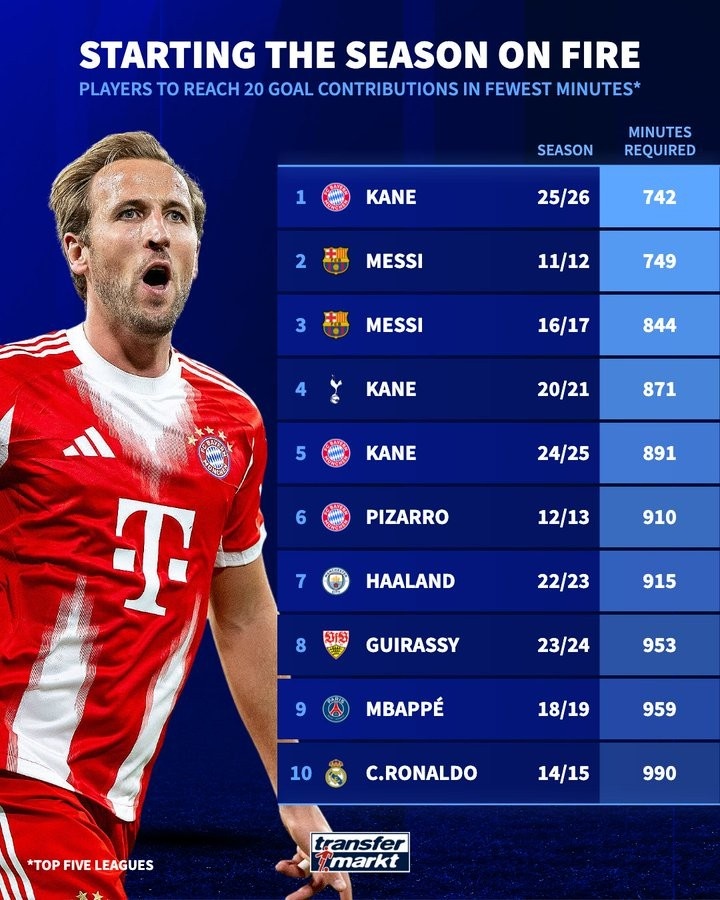 在10月1日的最新數據統計中,凱恩以驚人的表現達成了一個歷史性的裏程碑,成為了最快為俱樂部貢獻20球(包括進球和助攻)的球員。這個賽季,他在短短742分鐘的時間裏就完成了這一壯舉,甚至比梅西在2011年創下的紀錄還要快上7分鐘,成功刷新了歷史紀錄。