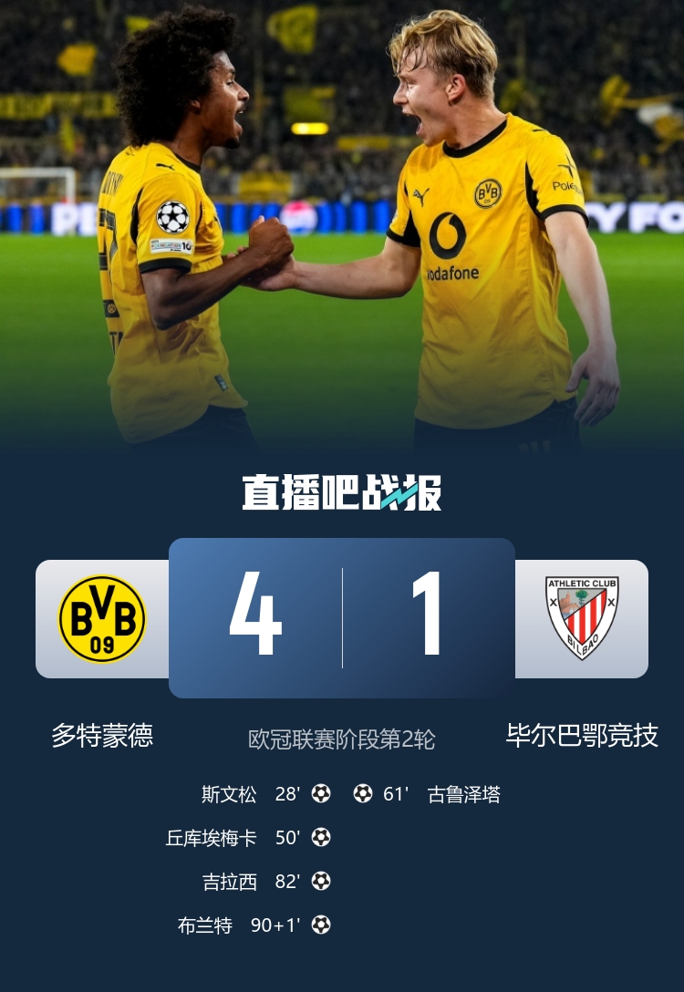 首页 > 新闻 > 歐冠戰報 多特以四比一擊敗畢爾巴鄂收獲首勝 丘庫埃梅卡攻破對方大門 聚勒失誤助攻吉拉西得分