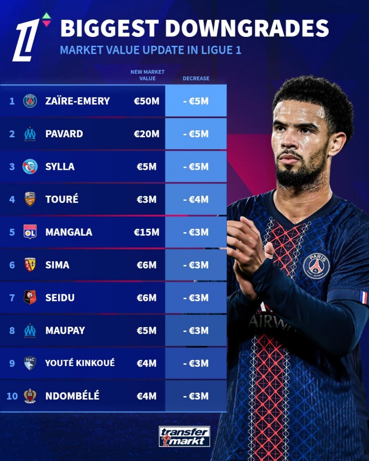 除此之外,洛裏昂的圖雷、裏昂的曼加拉、朗斯的西瑪、雷恩的塞杜、馬賽的莫派、勒阿弗爾的金庫,以及尼斯的恩東貝萊等球員的身價也出現了不同程度的下滑,幅度從300萬歐到400萬歐不等,顯示出了法甲聯賽在近期競爭激烈的市場中的一種趨勢。