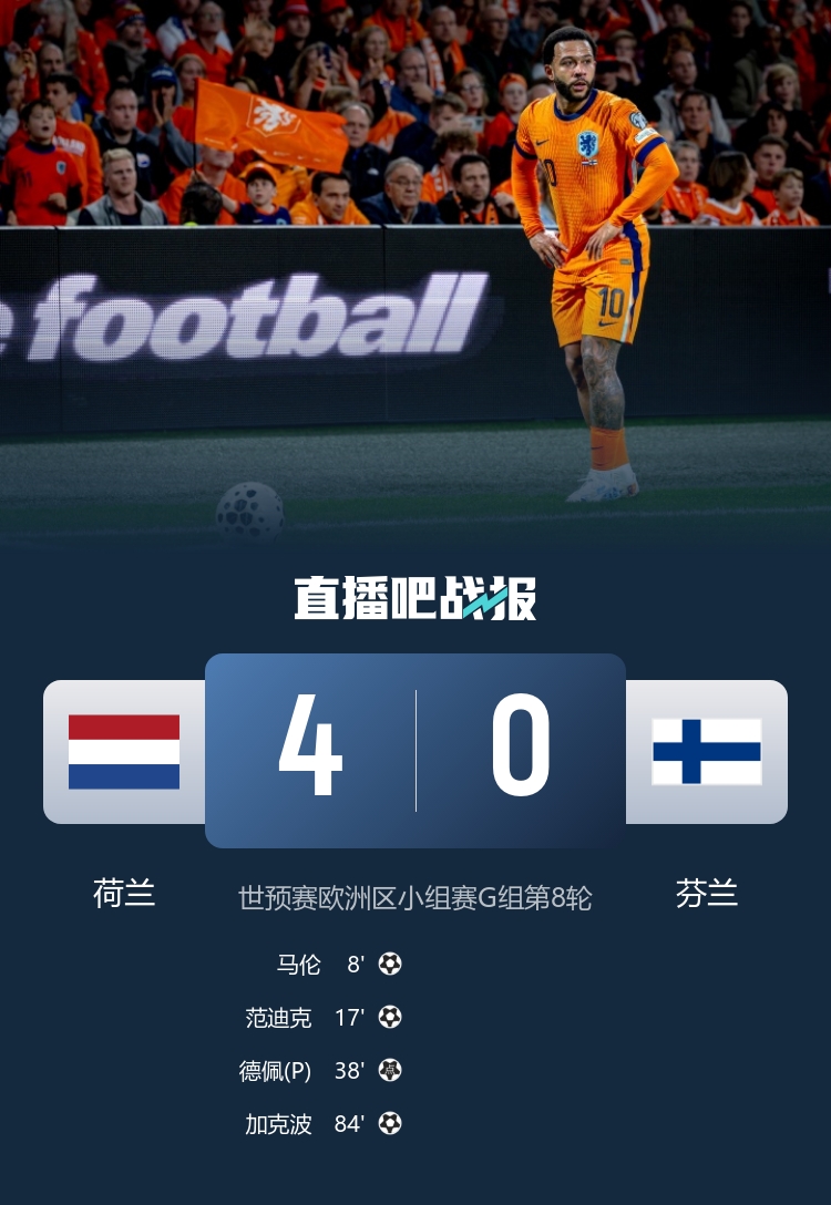 北京時間10月13日零點,世預賽歐洲區G組第8輪激戰在約翰克魯伊夫競技場打響,荷蘭隊迎戰芬蘭隊。比賽中,荷蘭展現了強大的攻擊力,以4-0的完美成績收獲勝利,繼續領先小組,保持著5勝1平的不敗紀錄。